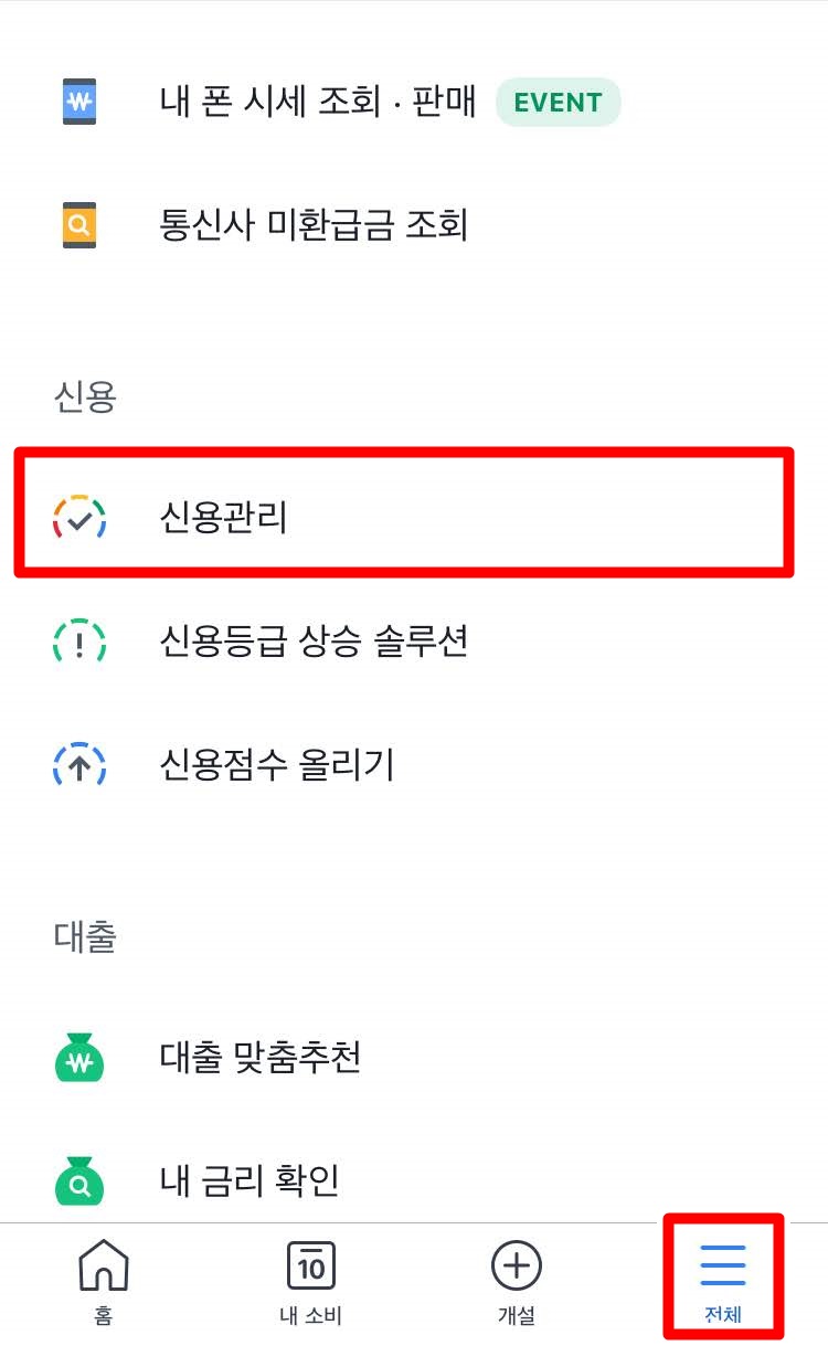 일단 토스 앱이 없으신분들은 토스를 설치합니다. 설치 로그인 방법은 간단하기 때문에 생략 하도록 하겠습니다. 로그인이 완료되었다는 가정하에 오른쪽 하단에 3단 바 전체라는 메뉴를 클릭하시면 위에 보이시는 데로 여러 메뉴들이 보입니다. 내 폰 시세와 통신사 미환급금까지 확인이 되네요. 일단 오늘은 토스 신용등급 조회가 목적이니 중간 정도에 위치해 있는 신용관리를 클릭합니다.